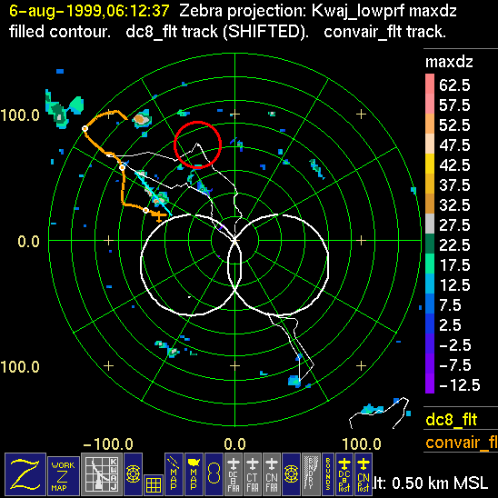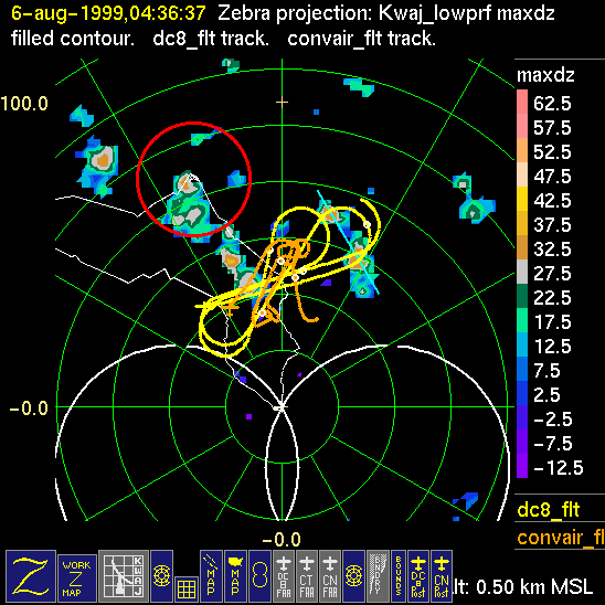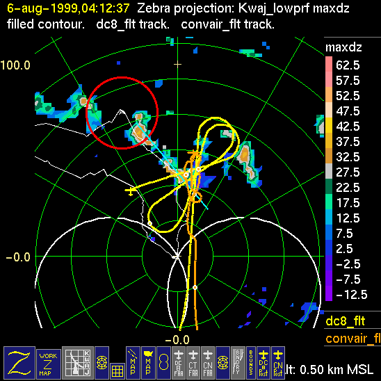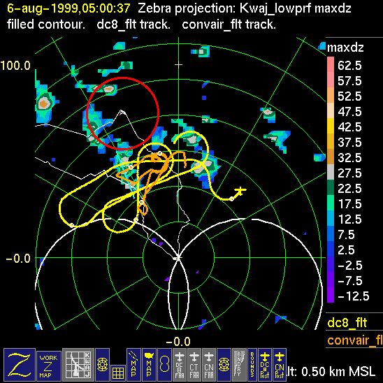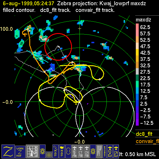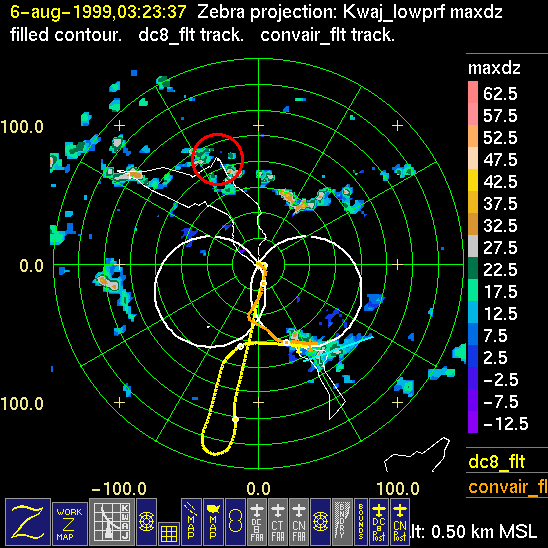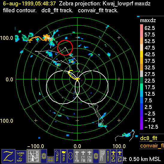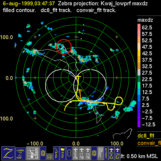 Mission summaries consist of Scientists' discussions of the flights and Radar Images overlayed with flight tracks. Separate discussions (written by the Aircraft Mission Coordinator and the chief airborne mission scientist on each aircraft participating in the mission) may be read by clicking on the "Scientists' Discussion" link shown below. Also shown below are the aircraft flight tracks (see color key below) superimposed on a series of radar echo patterns obtained by the Kwajalein S-band radar during flights. In some cases, horizontal maps of radar echo are accompanied by a vertical cross section of the radar reflectivity: indicated by light blue lines on the horizontal maps and displayed directly below them. The geography of the Kwajalein Atoll is outlined in white. The area covered by the radar is almost all open ocean. Range rings are at 10 nm intervals. The NOAA ship Ronald H. Brown is located ~22 nm (40 km) south of the Kwajalein radar. The overlapping white circles show the dual-Doppler radar lobes for the combined Kwajalein and ship radars. The red circle is a no-fly zone.