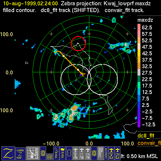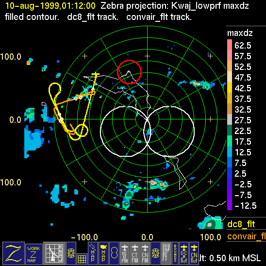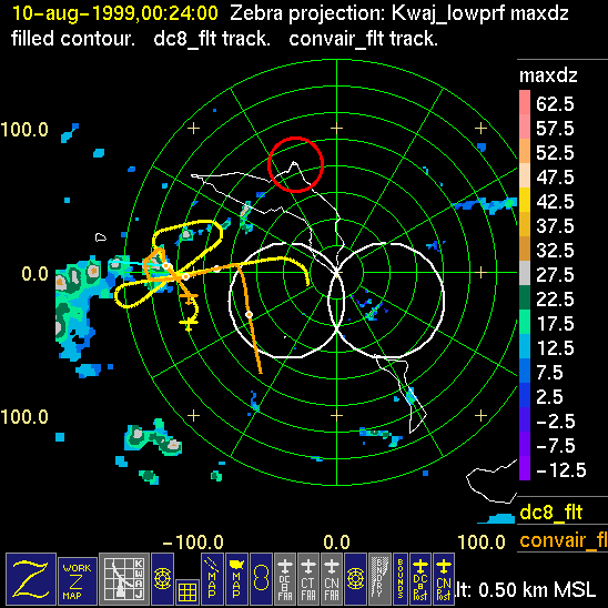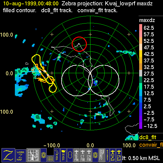 Mission summaries consist of Scientists' discussions of the flights and Radar Images overlayed with flight tracks. Separate discussions (written by the Aircraft Mission Coordinator and the chief airborne mission scientist on each aircraft participating in the mission) may be read by clicking on the "Scientists' Discussion" link shown below. Also shown below are the aircraft flight tracks (see color key below) superimposed on a series of radar echo patterns obtained by the Kwajalein S-band radar during flights. In some cases, horizontal maps of radar echo are accompanied by a vertical cross section of the radar reflectivity: indicated by light blue lines on the horizontal maps and displayed directly below them. The geography of the Kwajalein Atoll is outlined in white. The area covered by the radar is almost all open ocean. Range rings are at 10 nm intervals. The NOAA ship Ronald H. Brown is located ~22 nm (40 km) south of the Kwajalein radar. The overlapping white circles show the dual-Doppler radar lobes for the combined Kwajalein and ship radars. The red circle is a no-fly zone.