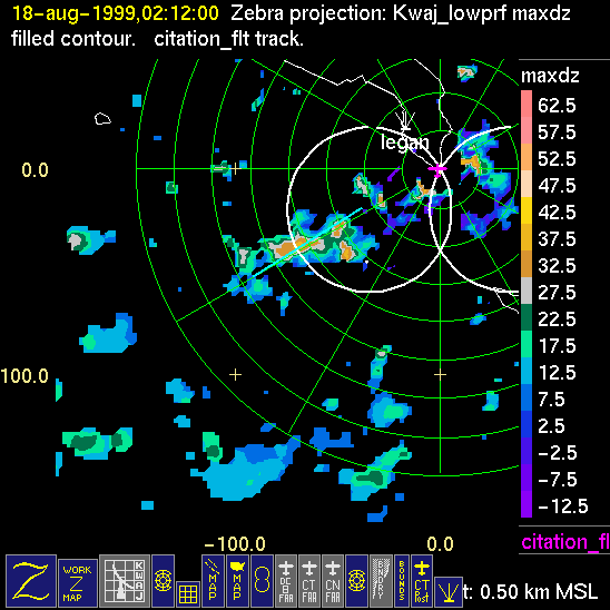 Mission summaries consist of Scientists' discussions of the flights and Radar Images overlayed with flight tracks. Separate discussions (written by the Aircraft Mission Coordinator and the chief airborne mission scientist on each aircraft participating in the mission) may be read by clicking on the "Scientists' Discussion" link shown below. Also shown below are the aircraft flight tracks (see color key below) superimposed on a series of radar echo patterns obtained by the Kwajalein S-band radar during flights. In some cases, horizontal maps of radar echo are accompanied by a vertical cross section of the radar reflectivity: indicated by light blue lines on the horizontal maps and displayed directly below them. The geography of the Kwajalein Atoll is outlined in white. The area covered by the radar is almost all open ocean. Range rings are at 10 nm intervals. The NOAA ship Ronald H. Brown is located ~22 nm (40 km) south of the Kwajalein radar. The overlapping white circles show the dual-Doppler radar lobes for the combined Kwajalein and ship radars. The red circle is a no-fly zone.