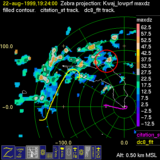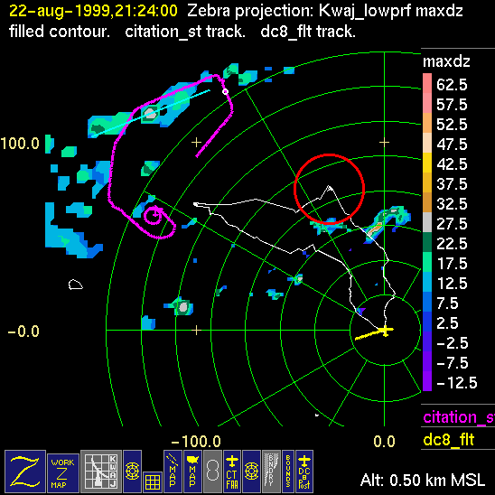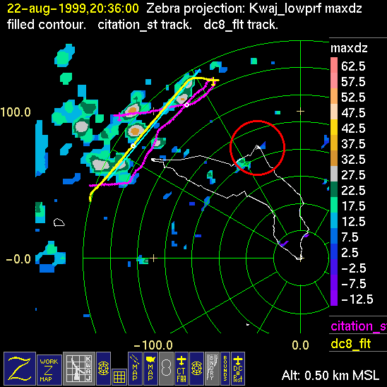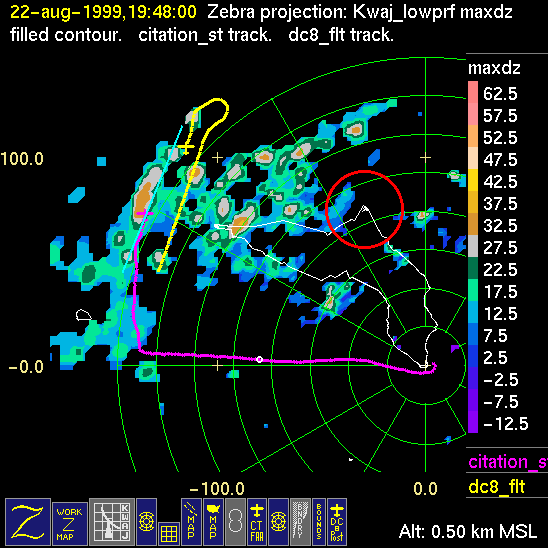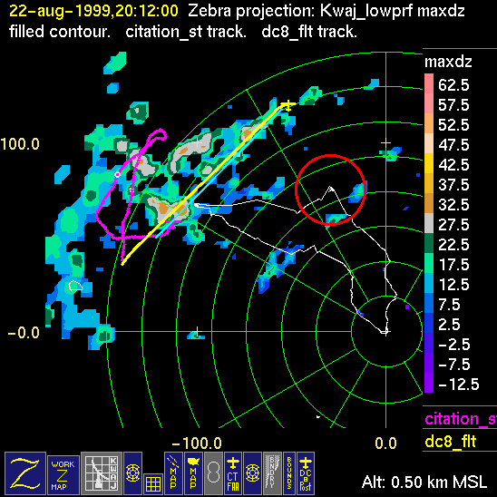 Mission summaries consist of Scientists' discussions of the flights and Radar Images overlayed with flight tracks. Separate discussions (written by the Aircraft Mission Coordinator and the chief airborne mission scientist on each aircraft participating in the mission) may be read by clicking on the "Scientists' Discussion" link shown below. Also shown below are the aircraft flight tracks (see color key below) superimposed on a series of radar echo patterns obtained by the Kwajalein S-band radar during flights. In some cases, horizontal maps of radar echo are accompanied by a vertical cross section of the radar reflectivity: indicated by light blue lines on the horizontal maps and displayed directly below them. The geography of the Kwajalein Atoll is outlined in white. The area covered by the radar is almost all open ocean. Range rings are at 10 nm intervals. The NOAA ship Ronald H. Brown is located ~22 nm (40 km) south of the Kwajalein radar. The overlapping white circles show the dual-Doppler radar lobes for the combined Kwajalein and ship radars. The red circle is a no-fly zone.