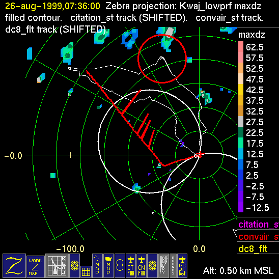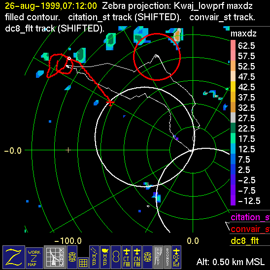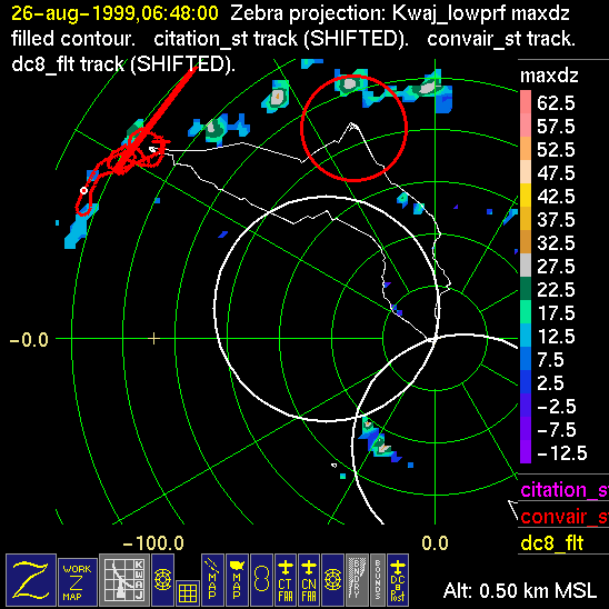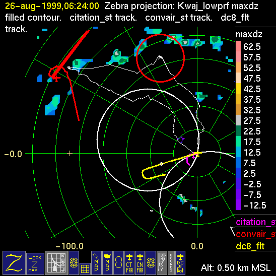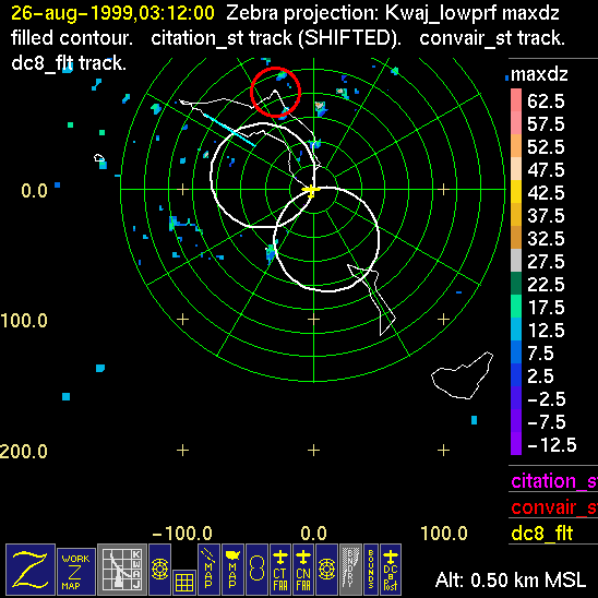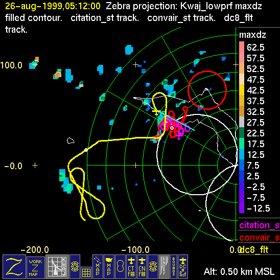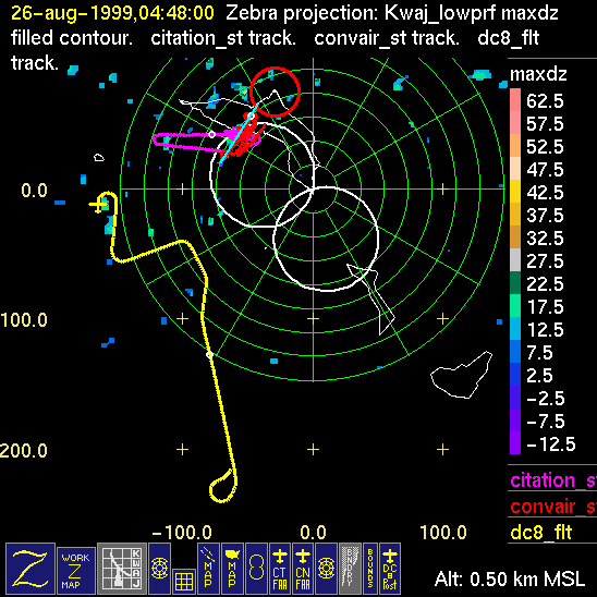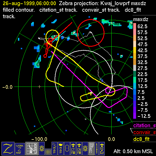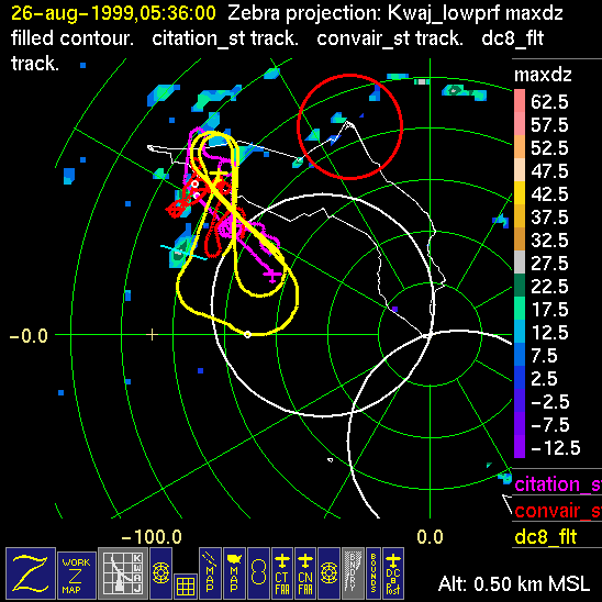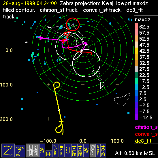 Mission summaries consist of Scientists' discussions of the flights and Radar Images overlayed with flight tracks. Separate discussions (written by the Aircraft Mission Coordinator and the chief airborne mission scientist on each aircraft participating in the mission) may be read by clicking on the "Scientists' Discussion" link shown below. Also shown below are the aircraft flight tracks (see color key below) superimposed on a series of radar echo patterns obtained by the Kwajalein S-band radar during flights. In some cases, horizontal maps of radar echo are accompanied by a vertical cross section of the radar reflectivity: indicated by light blue lines on the horizontal maps and displayed directly below them. The geography of the Kwajalein Atoll is outlined in white. The area covered by the radar is almost all open ocean. Range rings are at 10 nm intervals. The NOAA ship Ronald H. Brown is located ~22 nm (40 km) southwest of the Kwajalein radar. The overlapping white circles show the dual-Doppler radar lobes for the combined Kwajalein and ship radars. The red circle is a no-fly zone.