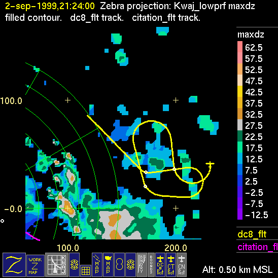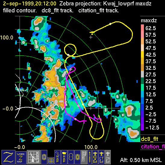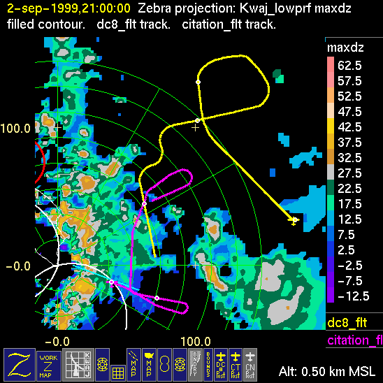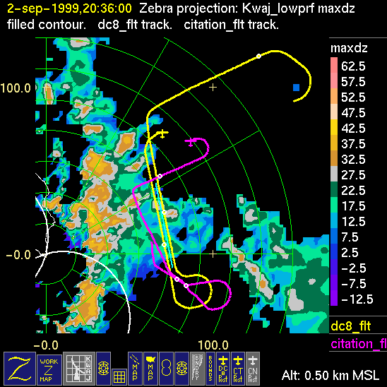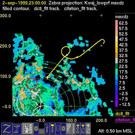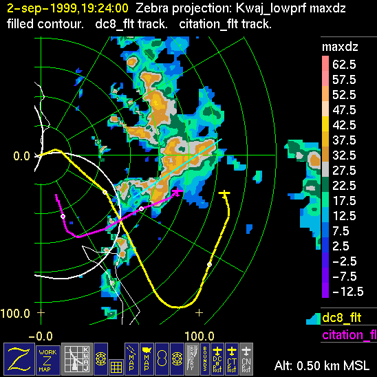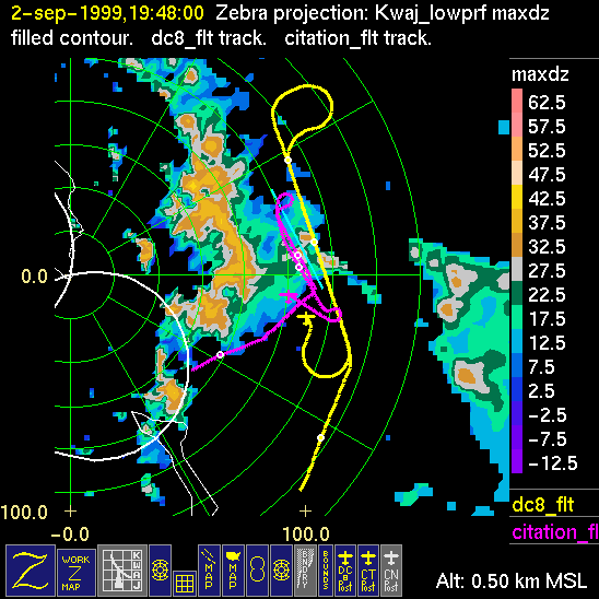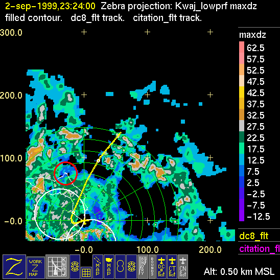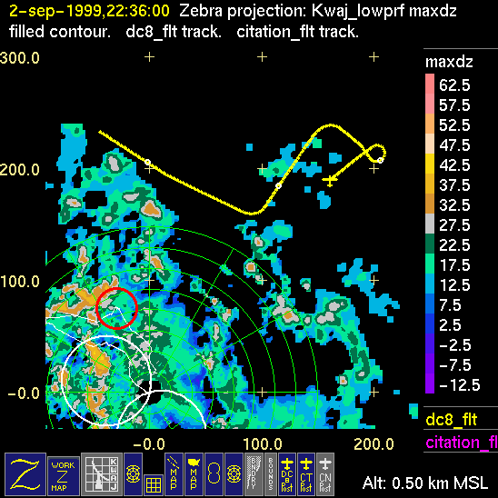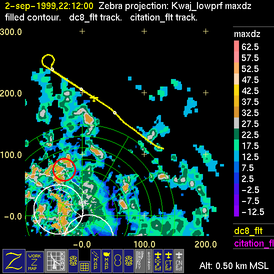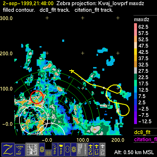 Mission summaries consist of Scientists' discussions of the flights and Radar Images overlayed with flight tracks. Separate discussions (written by the Aircraft Mission Coordinator and the chief airborne mission scientist on each aircraft participating in the mission) may be read by clicking on the "Scientists' Discussion" link shown below. Also shown below are the aircraft flight tracks (see color key below) superimposed on a series of radar echo patterns obtained by the Kwajalein S-band radar during flights. In some cases, horizontal maps of radar echo are accompanied by a vertical cross section of the radar reflectivity: indicated by light blue lines on the horizontal maps and displayed directly below them. The geography of the Kwajalein Atoll is outlined in white. The area covered by the radar is almost all open ocean. Range rings are at 10 nm intervals. The NOAA ship Ronald H. Brown is located ~22 nm (40 km) southwest of the Kwajalein radar. The overlapping white circles show the dual-Doppler radar lobes for the combined Kwajalein and ship radars. The red circle is a no-fly zone.