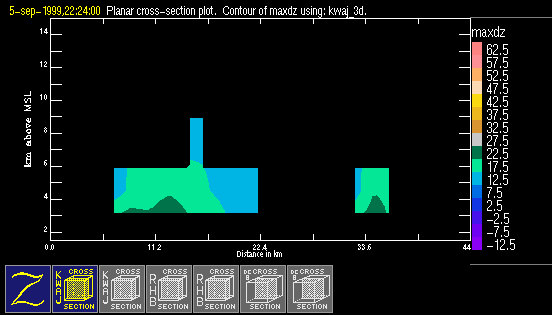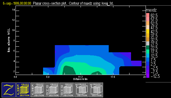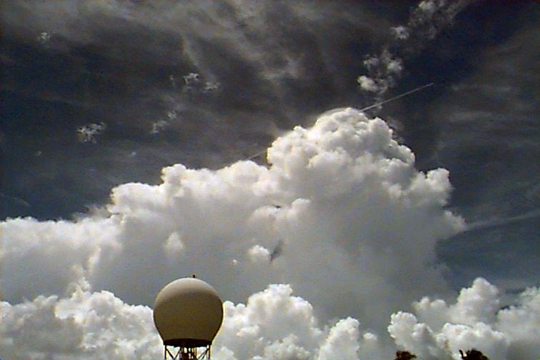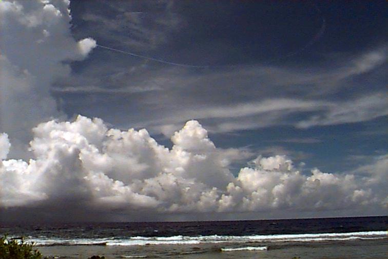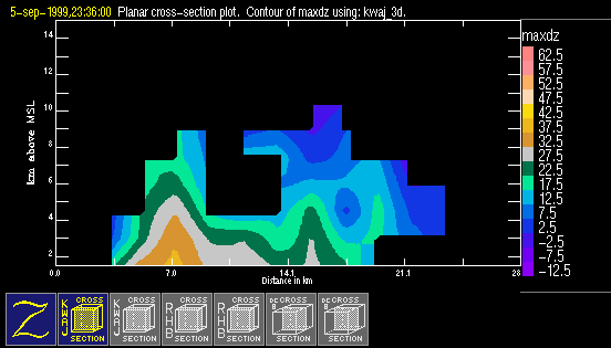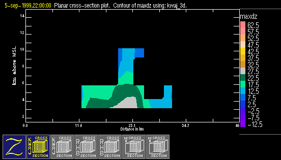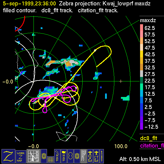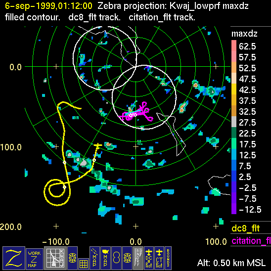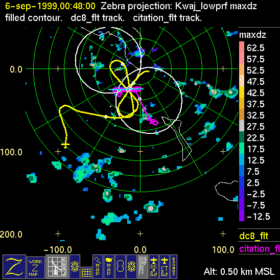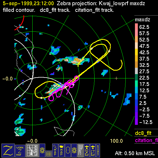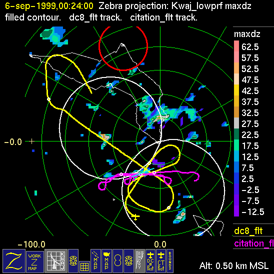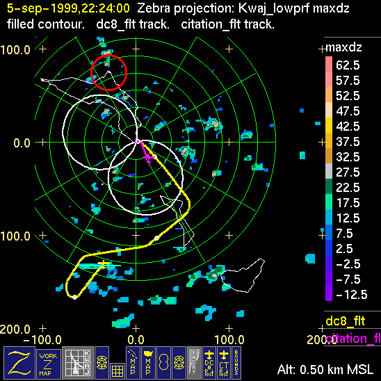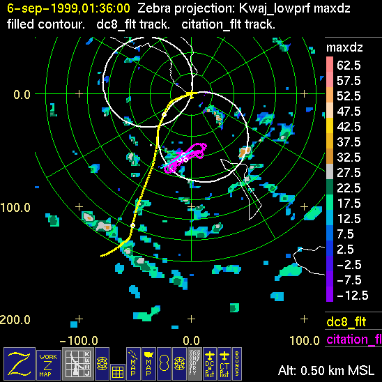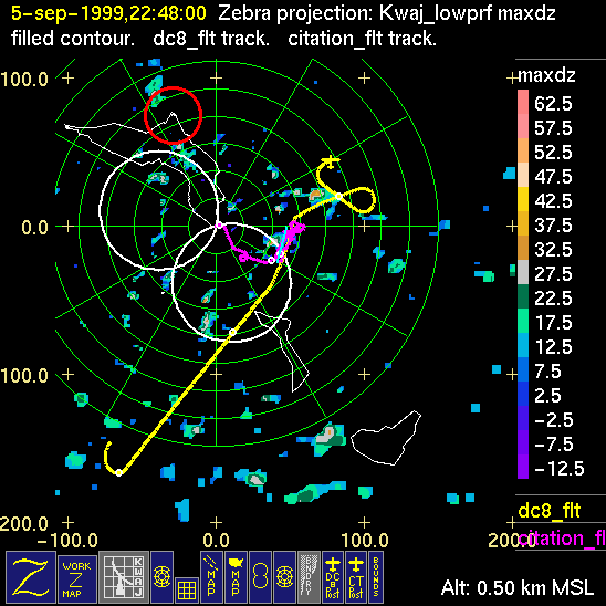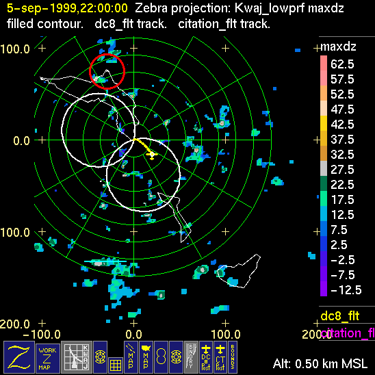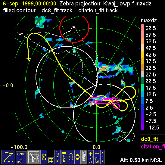 Mission summaries consist of Scientists' discussions of the flights and Radar Images overlayed with flight tracks. Separate discussions (written by the Aircraft Mission Coordinator and the chief airborne mission scientist on each aircraft participating in the mission) may be read by clicking on the "Scientists' Discussion" link shown below. Also shown below are the aircraft flight tracks (see color key below) superimposed on a series of radar echo patterns obtained by the Kwajalein S-band radar during flights. In some cases, horizontal maps of radar echo are accompanied by a vertical cross section of the radar reflectivity: indicated by light blue lines on the horizontal maps and displayed directly below them. The geography of the Kwajalein Atoll is outlined in white. The area covered by the radar is almost all open ocean. Range rings are at 10 nm intervals. The NOAA ship Ronald H. Brown is located ~22 nm (40 km) southwest of the Kwajalein radar. The overlapping white circles show the dual-Doppler radar lobes for the combined Kwajalein and ship radars. The red circle is a no-fly zone.