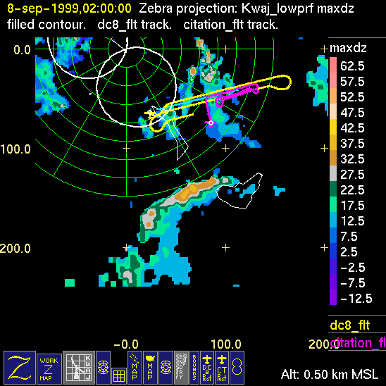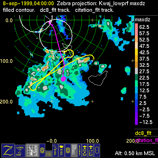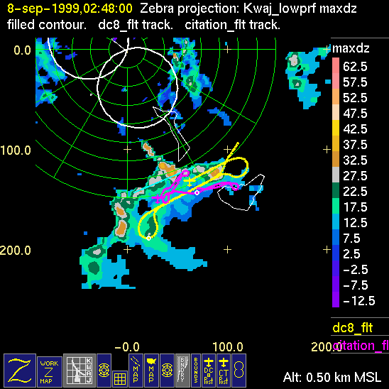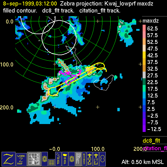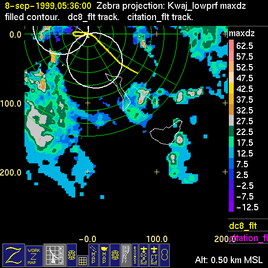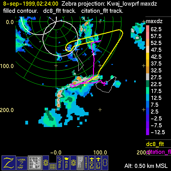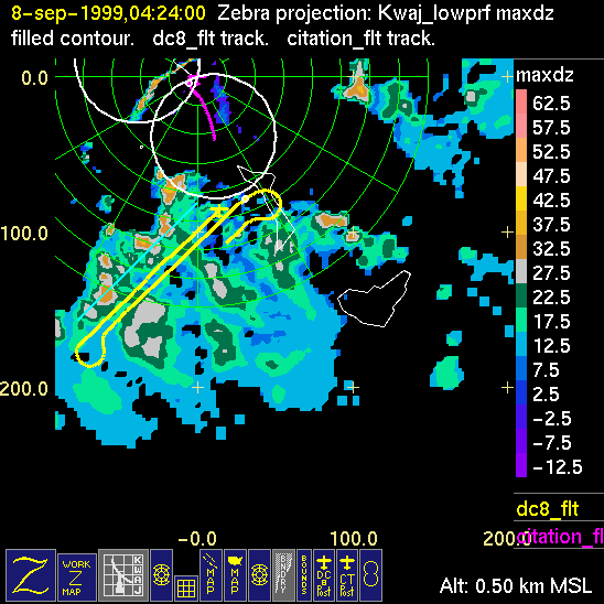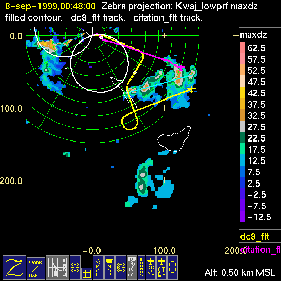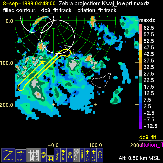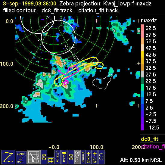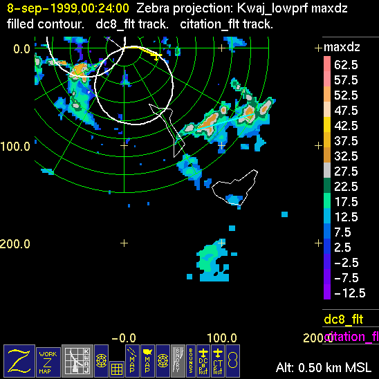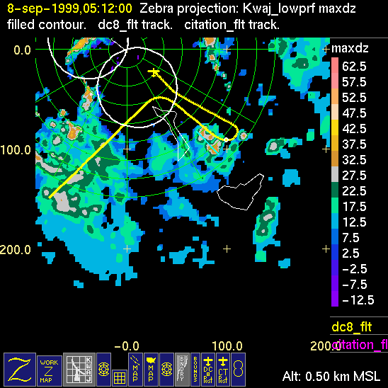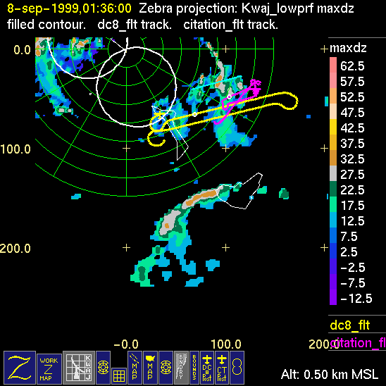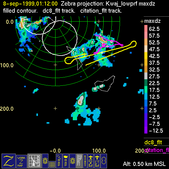Mission summaries consist of Scientists' discussions of the flights and Radar Images overlayed with flight tracks. Separate discussions (written by the Aircraft Mission Coordinator and the chief airborne mission scientist on each aircraft participating in the mission) may be read by clicking on the "Scientists' Discussion" link shown below. Also shown below are the aircraft flight tracks (see color key below) superimposed on a series of radar echo patterns obtained by the Kwajalein S-band radar during flights. In some cases, horizontal maps of radar echo are accompanied by a vertical cross section of the radar reflectivity: indicated by light blue lines on the horizontal maps and displayed directly below them. The geography of the Kwajalein Atoll is outlined in white. The area covered by the radar is almost all open ocean. Range rings are at 10 nm intervals. The NOAA ship Ronald H. Brown is located ~22 nm (40 km) southwest of the Kwajalein radar. The overlapping white circles show the dual-Doppler radar lobes for the combined Kwajalein and ship radars. The red circle is a no-fly zone.