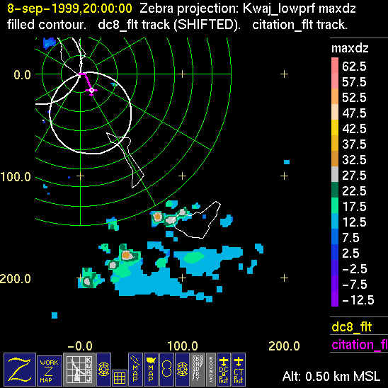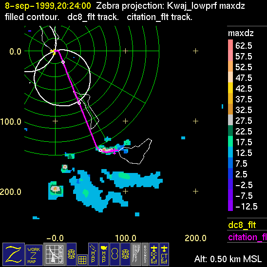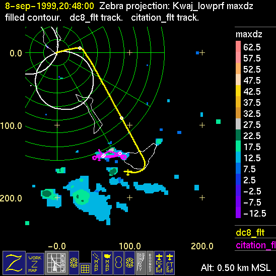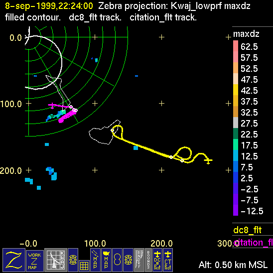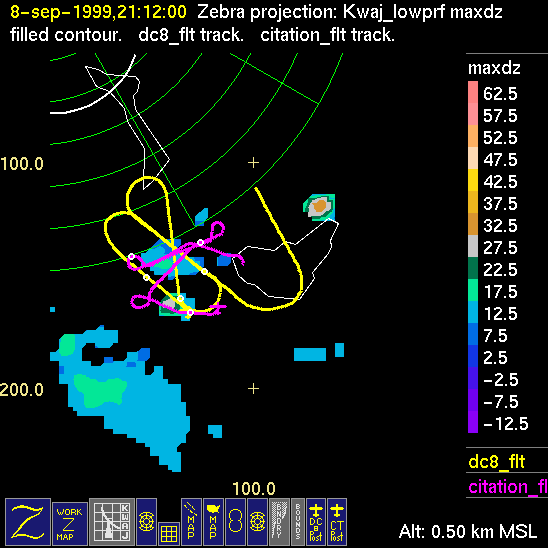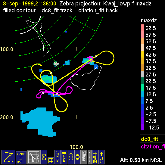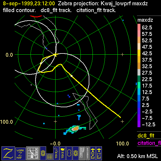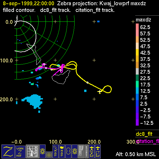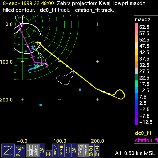 Mission summaries consist of Scientists' discussions of the flights and Radar Images overlayed with flight tracks. Separate discussions (written by the Aircraft Mission Coordinator and the chief airborne mission scientist on each aircraft participating in the mission) may be read by clicking on the "Scientists' Discussion" link shown below. Also shown below are the aircraft flight tracks (see color key below) superimposed on a series of radar echo patterns obtained by the Kwajalein S-band radar during flights. In some cases, horizontal maps of radar echo are accompanied by a vertical cross section of the radar reflectivity: indicated by light blue lines on the horizontal maps and displayed directly below them. The geography of the Kwajalein Atoll is outlined in white. The area covered by the radar is almost all open ocean. Range rings are at 10 nm intervals. The NOAA ship Ronald H. Brown is located ~22 nm (40 km) southwest of the Kwajalein radar. The overlapping white circles show the dual-Doppler radar lobes for the combined Kwajalein and ship radars. The red circle is a no-fly zone.