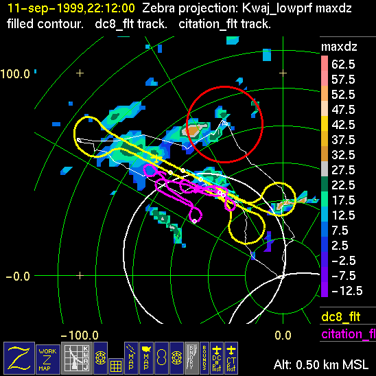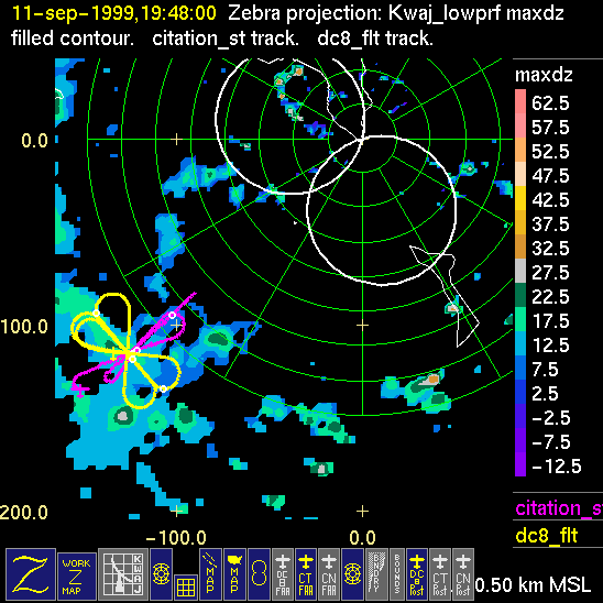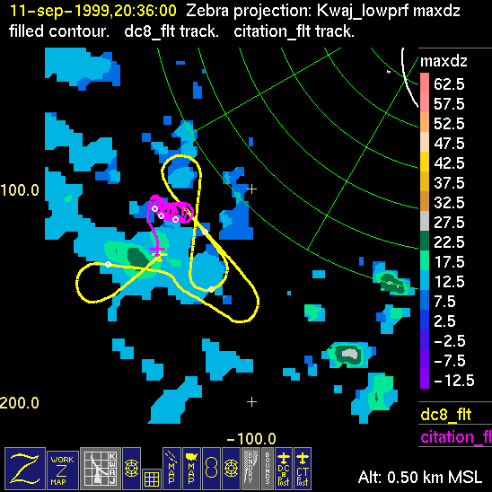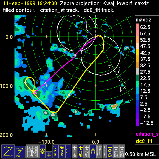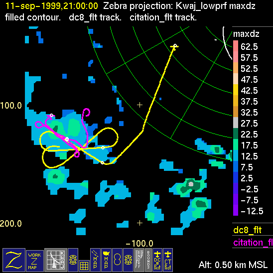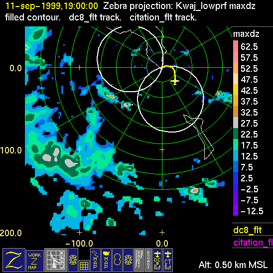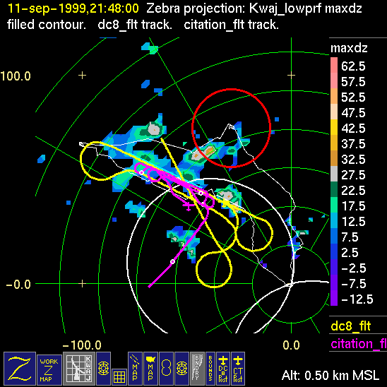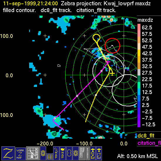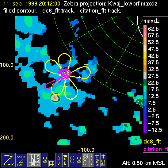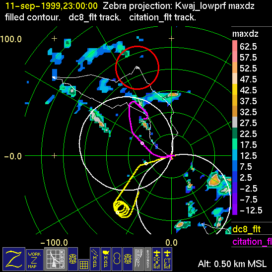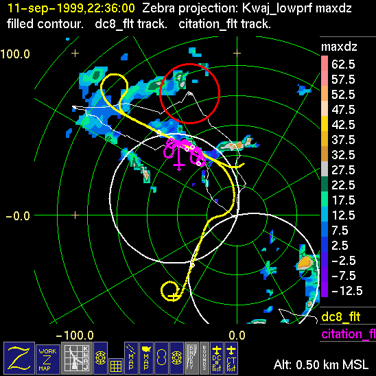Mission summaries consist of Scientists' discussions of the flights and Radar Images overlayed with flight tracks. Separate discussions (written by the Aircraft Mission Coordinator and the chief airborne mission scientist on each aircraft participating in the mission) may be read by clicking on the "Scientists' Discussion" link shown below. Also shown below are the aircraft flight tracks (see color key below) superimposed on a series of radar echo patterns obtained by the Kwajalein S-band radar during flights. In some cases, horizontal maps of radar echo are accompanied by a vertical cross section of the radar reflectivity: indicated by light blue lines on the horizontal maps and displayed directly below them. The geography of the Kwajalein Atoll is outlined in white. The area covered by the radar is almost all open ocean. Range rings are at 10 nm intervals. The NOAA ship Ronald H. Brown is located ~22 nm (40 km) southwest of the Kwajalein radar. The overlapping white circles show the dual-Doppler radar lobes for the combined Kwajalein and ship radars. The red circle is a no-fly zone.