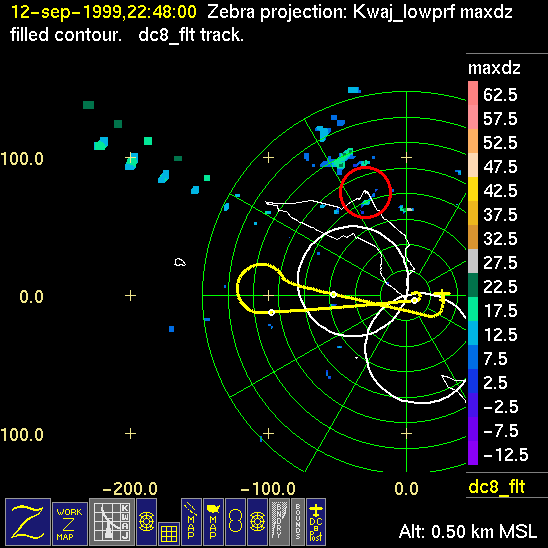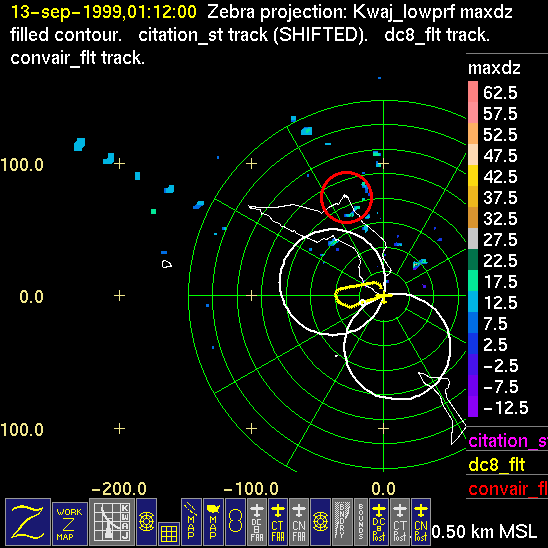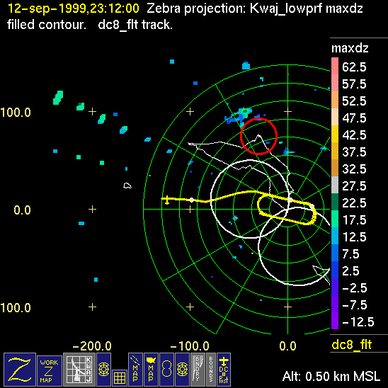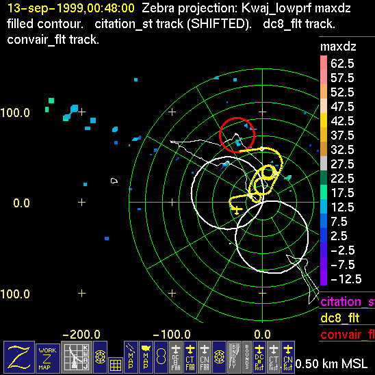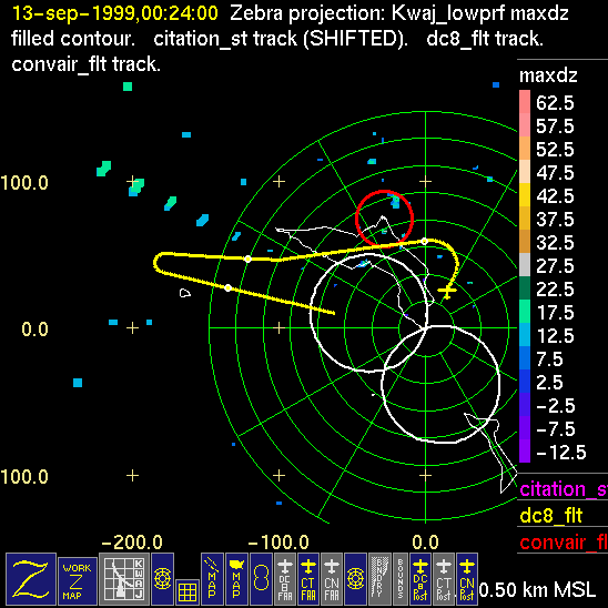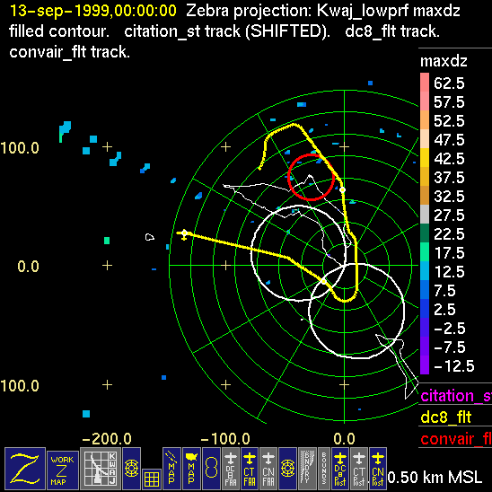 Mission summaries consist of Scientists' discussions of the flights and Radar Images overlayed with flight tracks. Separate discussions (written by the Aircraft Mission Coordinator and the chief airborne mission scientist on each aircraft participating in the mission) may be read by clicking on the "Scientists' Discussion" link shown below. Also shown below are the aircraft flight tracks (see color key below) superimposed on a series of radar echo patterns obtained by the Kwajalein S-band radar during flights. In some cases, horizontal maps of radar echo are accompanied by a vertical cross section of the radar reflectivity: indicated by light blue lines on the horizontal maps and displayed directly below them. The geography of the Kwajalein Atoll is outlined in white. The area covered by the radar is almost all open ocean. Range rings are at 10 nm intervals. The NOAA ship Ronald H. Brown is located ~22 nm (40 km) southwest of the Kwajalein radar. The overlapping white circles show the dual-Doppler radar lobes for the combined Kwajalein and ship radars. The red circle is a no-fly zone.