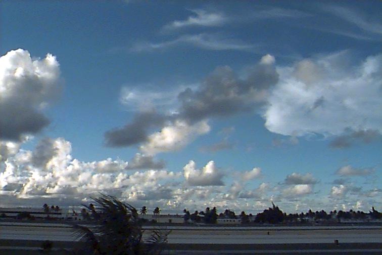 Cumulus clouds with moderate vertical extent to the North. Areas of altocumulus clouds overhead with Cirrus clouds covering the eastern part of the sky. |