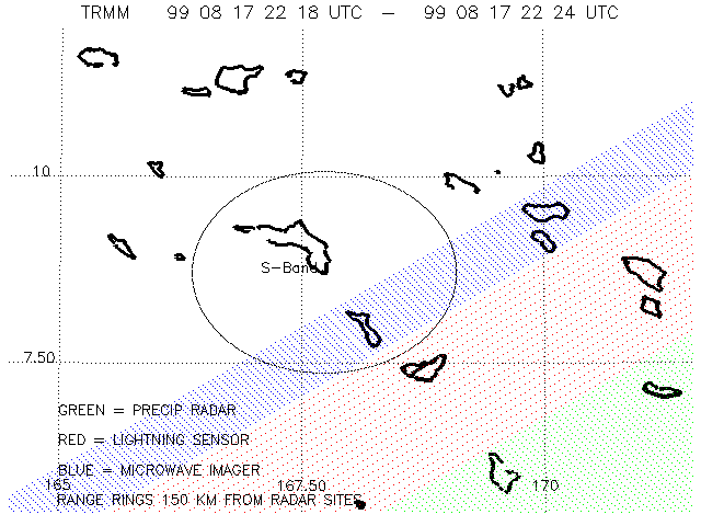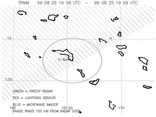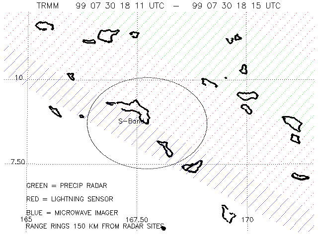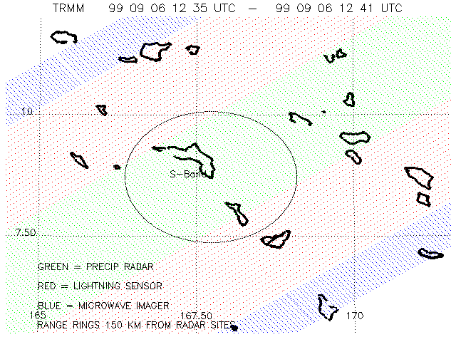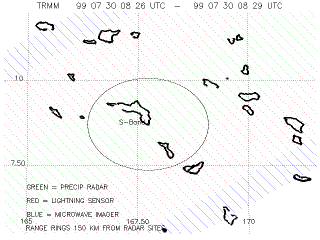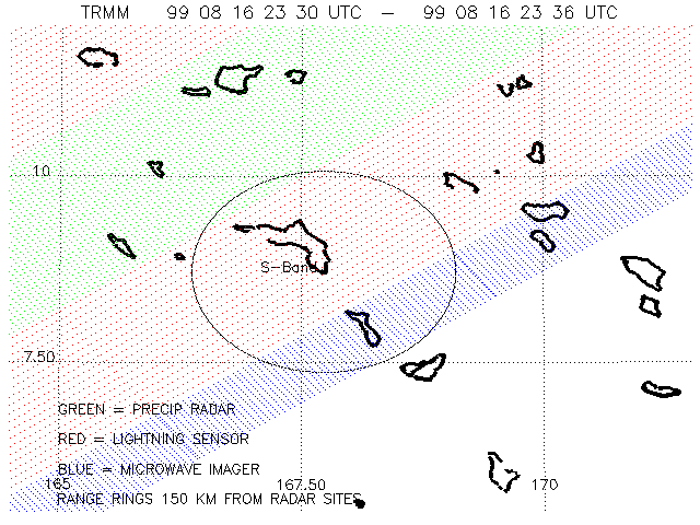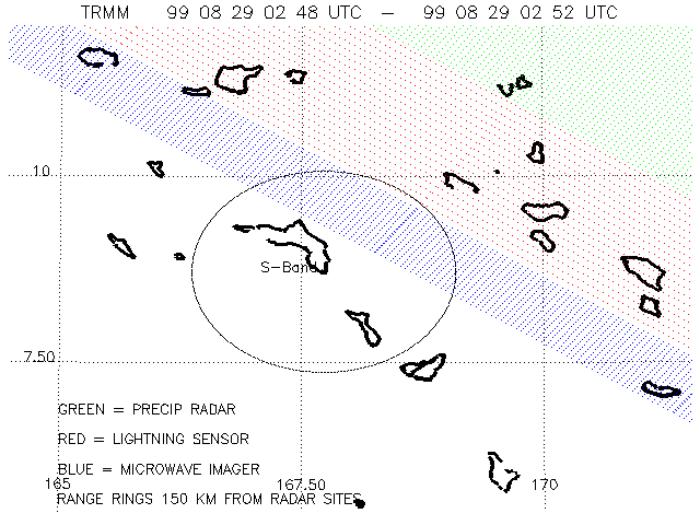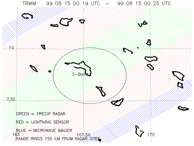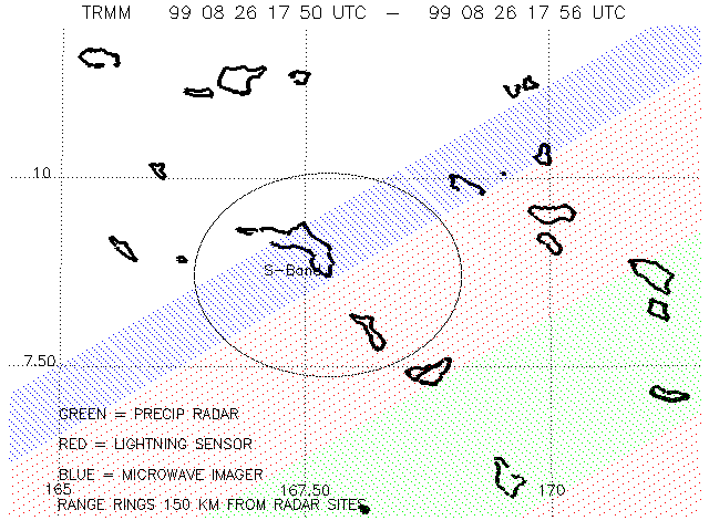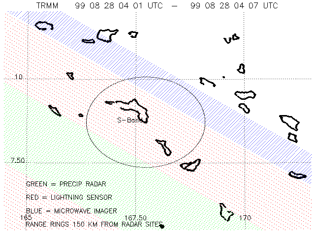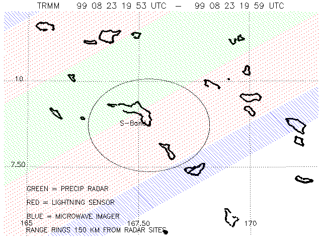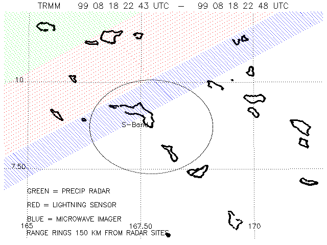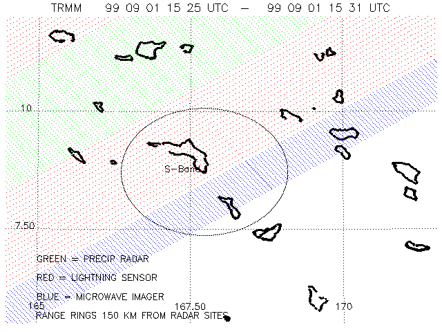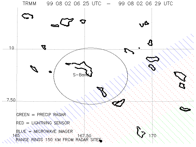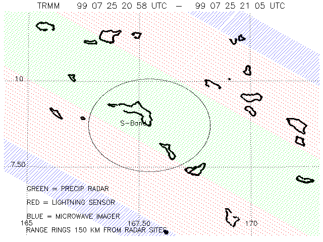 S-band radar area (150 km radius centered on Kwajalein) with the PR and