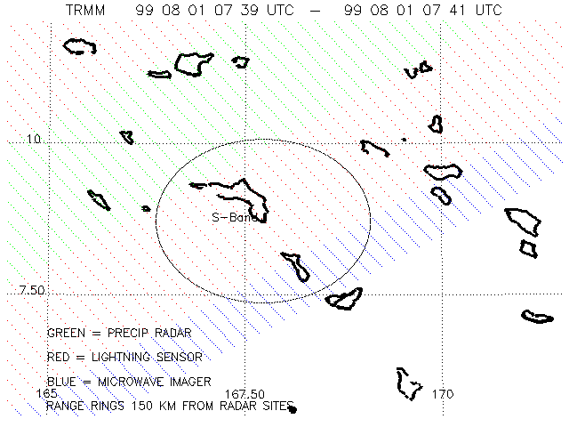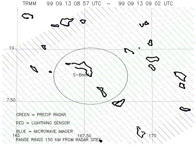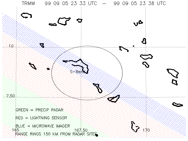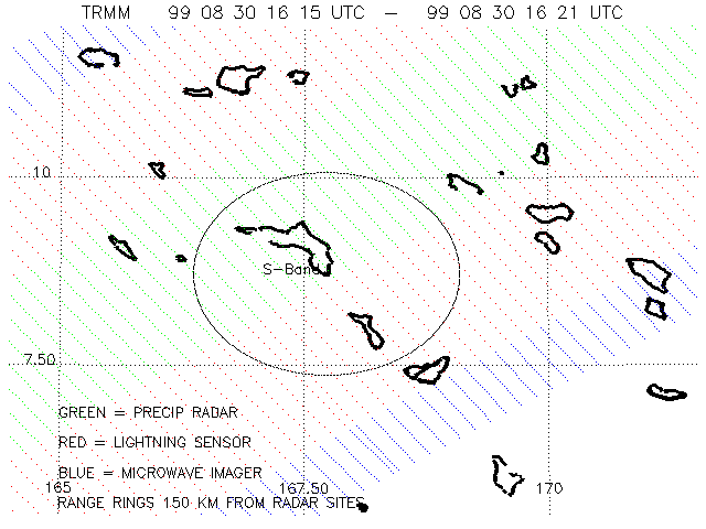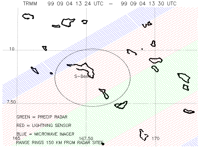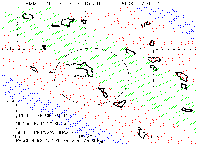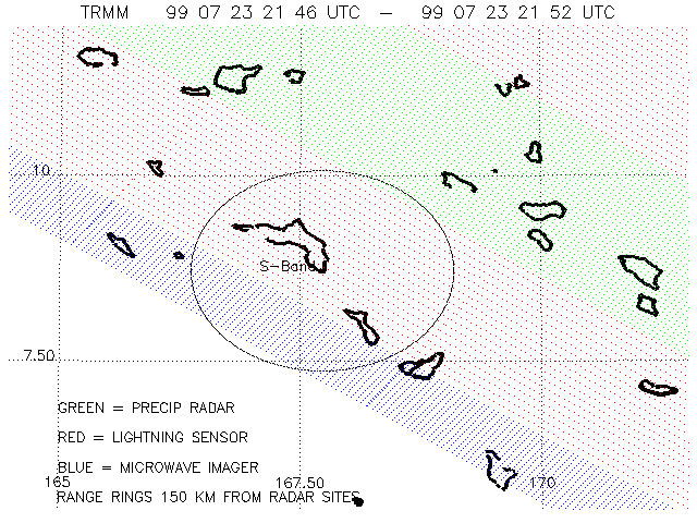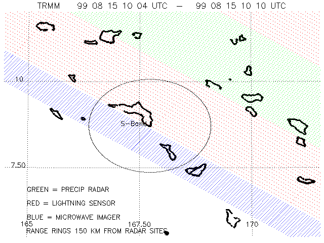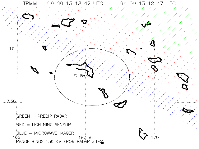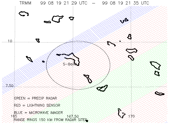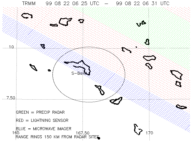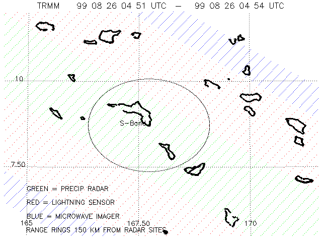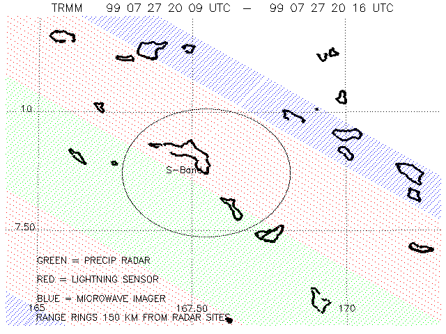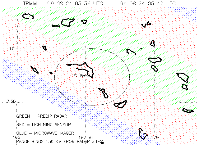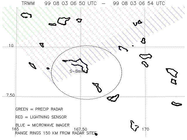 S-band radar area (150 km radius centered on Kwajalein) with the PR and