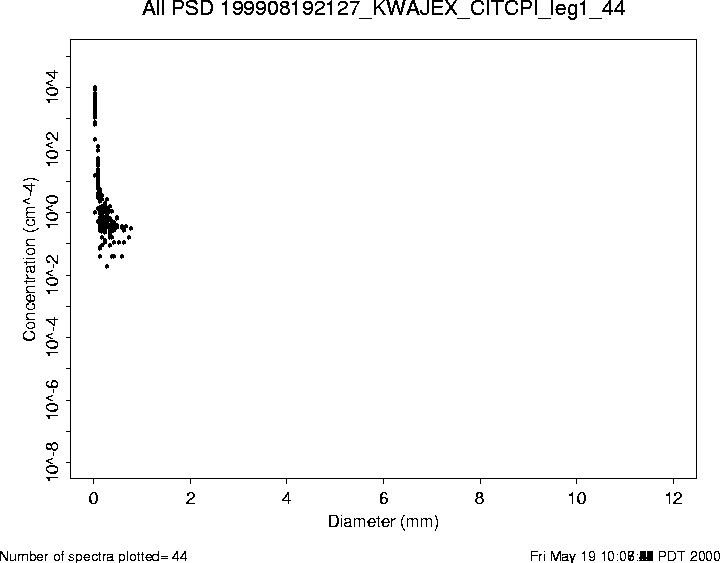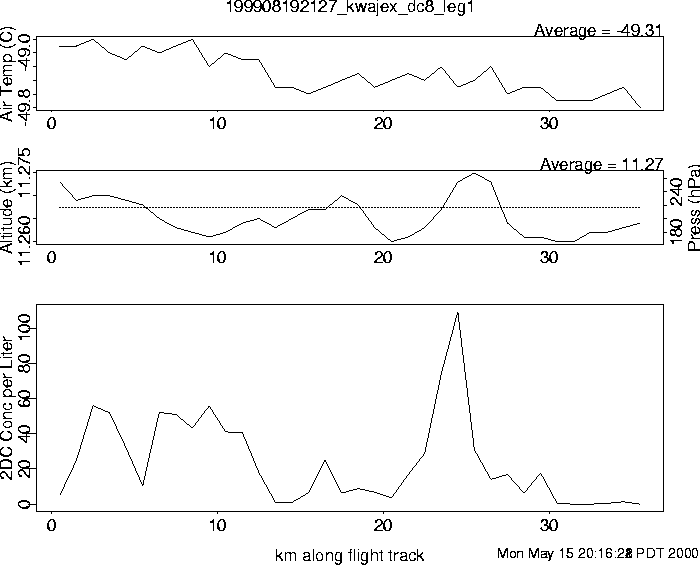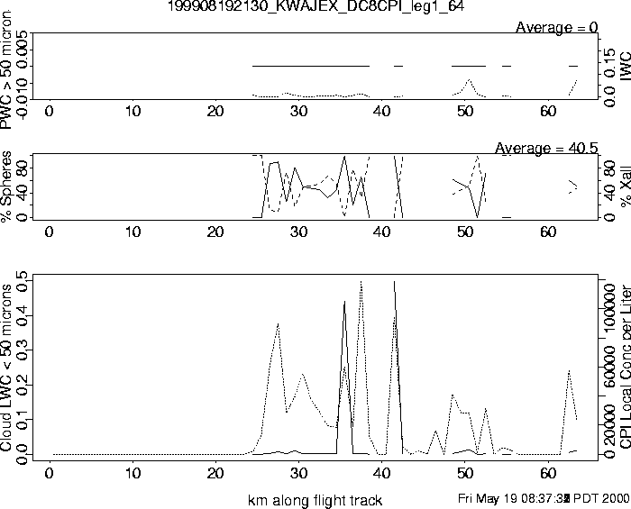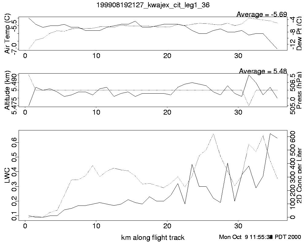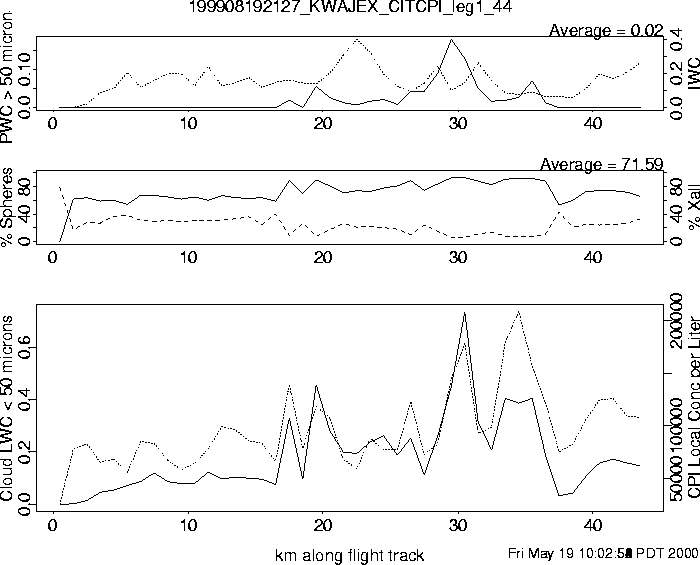 KWAJEX Microphysics Leg 1 - 19 AUG 2127 CMPD Products Table For the time series plots, the solid line corresponds to the variable on the left axis and the dashed line corresponds to the variable on the right axis.