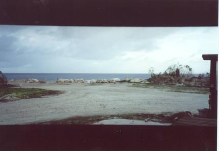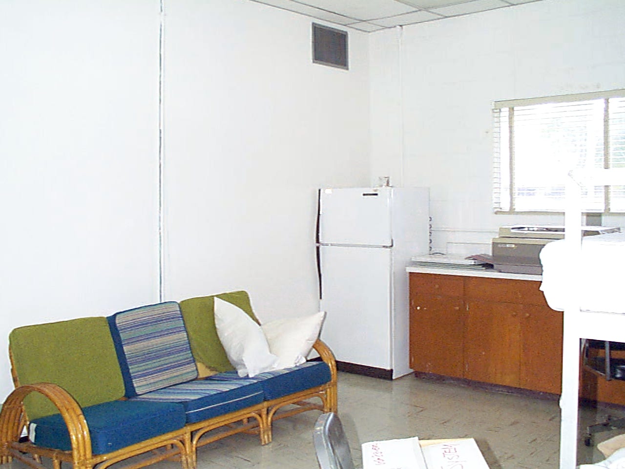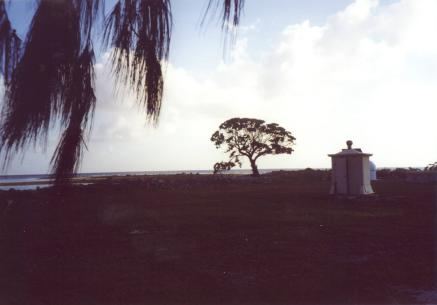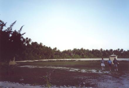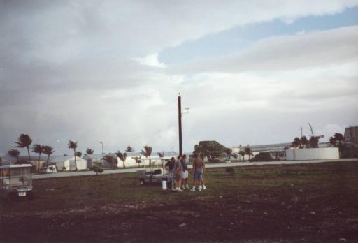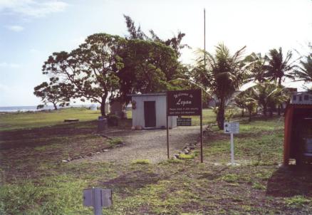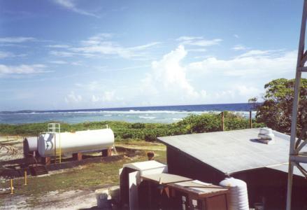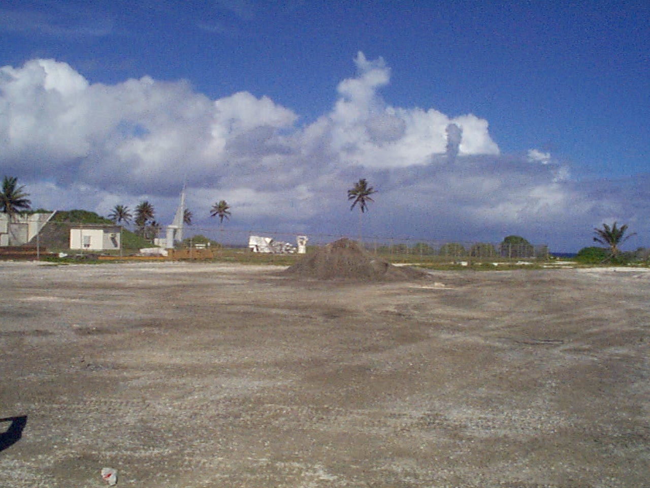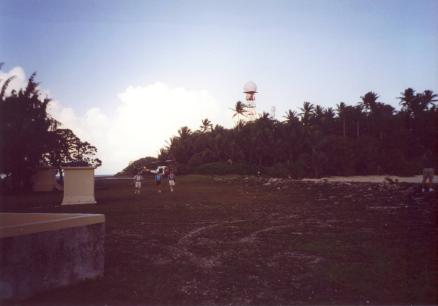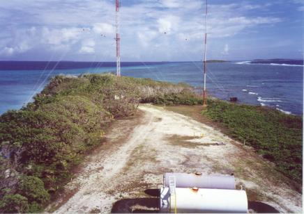 The cleared area of Legan is small and is primarily occupied by the helipad. The pathway from the boat ramp to the fuel storage near the cluster of buildings needs to be kept clear. With these considerations in mind, the only feasible location is about half way between the cluster of buildings and the helipad between two outhouses. This site would have unobstructed exposure to the sea surface on the lagoon side of the island and some blockage of the ocean side by vegation.