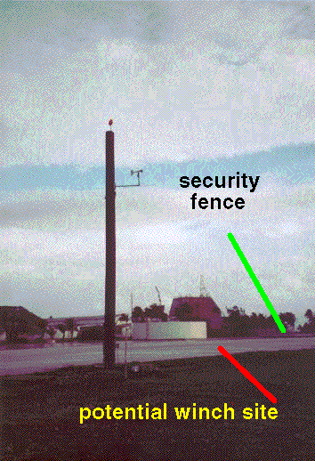 Given the constraints of staying south of the fence, needing an open space away from the immediate vicinity of buildings and towers, h, and the desire for a hard surface on which to anchor the winch the proposed locations are both unfortunately very close to the helipad. There is an existing pole with Aeromet surface meteorological instruments near the rain gauge.