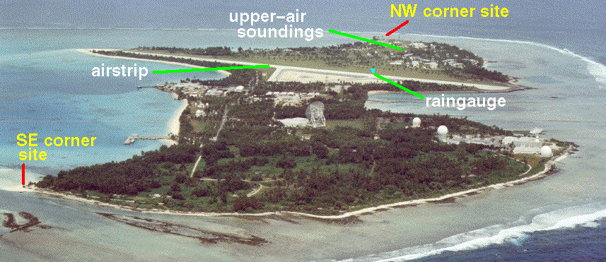 Kwalajein Island is only 1/2 mile wide and 2 1/2 miles long. Since no location on Kwajalein Island is more than 5 miles from the airfield, Kwajalein Island locations are not feasible. All KMR-controlled islands are accessible by marine transport can meet the tethered sonde power requirements. Active KMR islands on the east reef (east side of atoll) are the only potential sites meeting requirements for power and easterly exposure. These islands are Meck, Gagan and Roi-Namur.