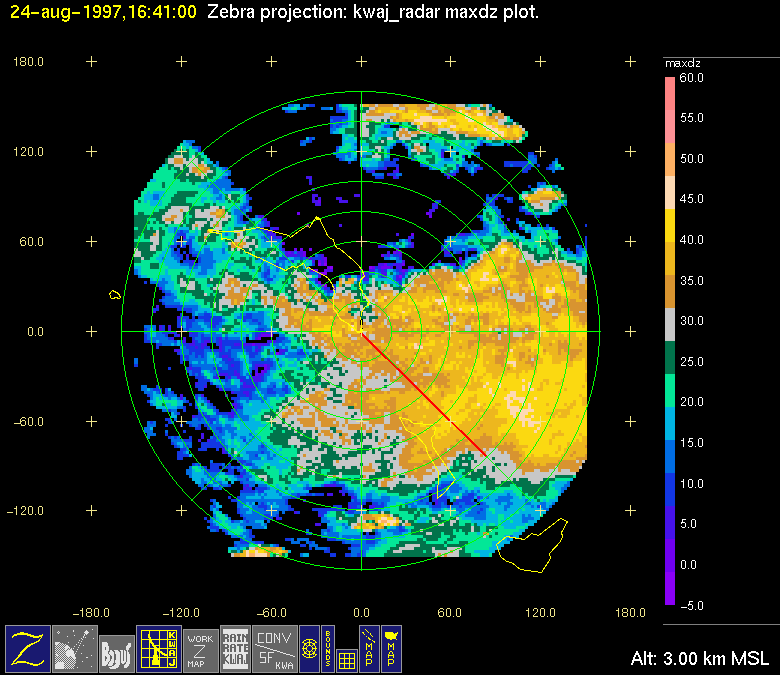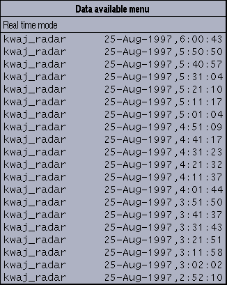 An abbreviated description of the currently enabled data directories is written at the top of each of the three main windows. For example, in Fig. 1, we see that the kwaj_radar directory (containing the radar data file) is currently enabled. Also, at the top left-hand corner of each window, a date and time are printed. The date and time indicate a reference time from which Zebra searches backwards through the enabled directories for available files. This time and date DO NOT represent the exact time and date of the data fields that are being displayed. NOTE: Zebra is in history mode if the font color of the date and time is yellow; Otherwise, Zebra is in real-time mode (see Keeping Track of the Time Mode).