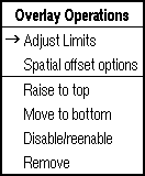 By clicking on any of these large icons (in either the xsect or big directory) with the left mouse button, the "Overlay Operations" menu is activated (Fig. 4). The first item on this menu allows you to adjust your contour intervals using the submenu "Adjust Limits" (see Plotting Functions). The submenu allows the user to specify the contour intervals of the current displayed field with "Center/Step" and to adjust highlights with "Highlight/Range".