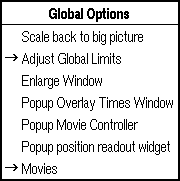 The "Z" icon at the bottom-left hand corner of each window controls the global parameters for that particular window. By clicking on the window with the left mouse button, the "Global Options" menu is activated (see Fig. 3). Not all of these menu items apply to the xsect windows. "Enlarge Window", "Popup Overlay Times") apply to both xsect and big. The other items in this menu only apply to big. These options allow you to zoom back out to the global domain ("Scale back to big picture"), change the global domain displayable by big ("Adjust Global Limits"), and activate the Position widget which indicates the coordinates of any pixel in big specified by the left mouse button. By clicking on the "Z" icon with the right mouse button, one can specify the color and font size of the plot annotation. (NOTE: Submenus are indicated by a right-pointing arrow. To activate them, simply highlight the item that is indicated by an arrow, then move the mouse to the right).