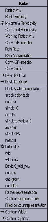 The smaller icons in big represent (from left to right in Fig. 1): radar range rings, the line segment representing the location of the vertical cross-sections ("BOUNDS"), grid outlines, radar range rings, and map outlines ("MAP"). By clicking on the appropriate icon with any of these icons with the middle, or right mouse buttons, specific menus are activated which allow the user to alter the properties of these overlays.