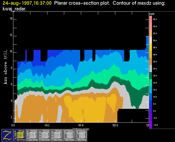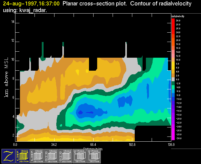 In the xsect windows, the icons labeled "cross section" all represent a single directory where radar data are stored (in this case "kwaj_radar"). For a detailed description of buttons in the big window, refer to the Button Appendix. The icon depicting a radar dish represents the radar directory ("kwaj_radar"), and the icon depicting a satellite over the earth represents a group of directories containing satellite data.
