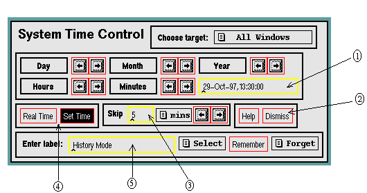 the reference time (for history mode only), (2) the "Dismiss" button, (3)