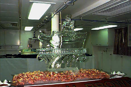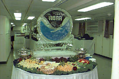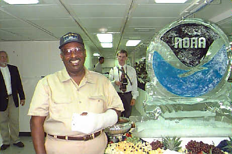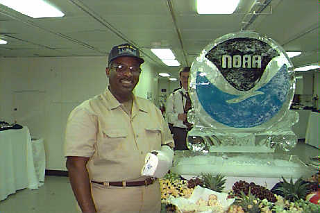 Chief Steward Allen Gary standing next to the NOAA ice sculpture. His bad arm prevented him from coming on the first cruise of the RONALD H. BROWN.