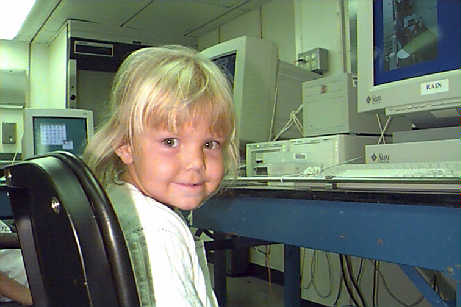 Ms. Jessica Piness is working at the computer in the science lab on the RONALD H. BROWN.