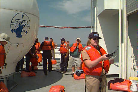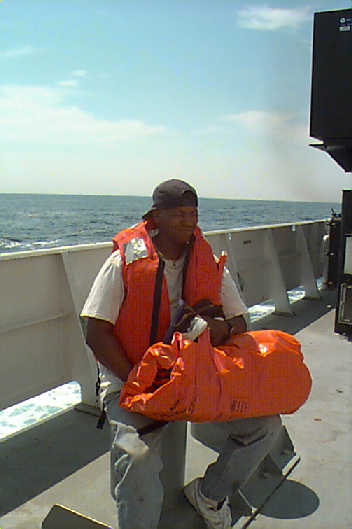 Survey Technician Jonathan Shannahoff is all geared up for this abandon ship drill.