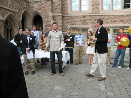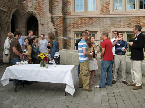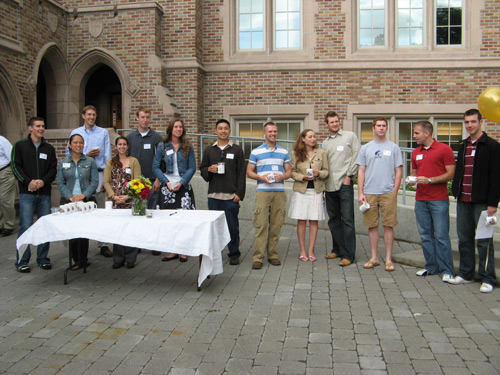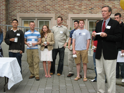 After the ceremony, students mingle. Standing to Prof. Hartmann's right are seniors Matt White and Bryce Land (not pictured in earlier photo). Back to top |