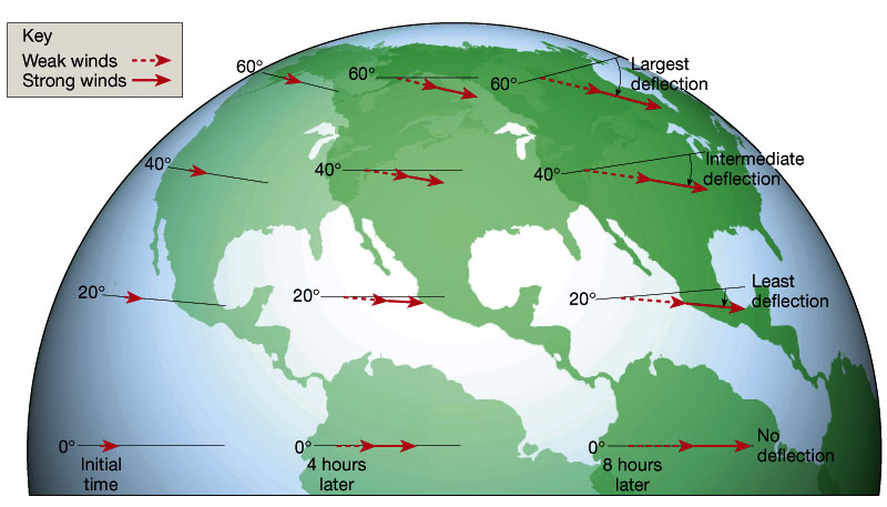 A3: Set the Earth's angular velocity (omega) to zero in coriolis_cHH.m and compute trajectories (using the modified script) for a case with initial latitude = 60 deg, u = 100 m/s, v=0 and run time = 5 days. Explain why the curves in Figures 1 and 2 look so different.