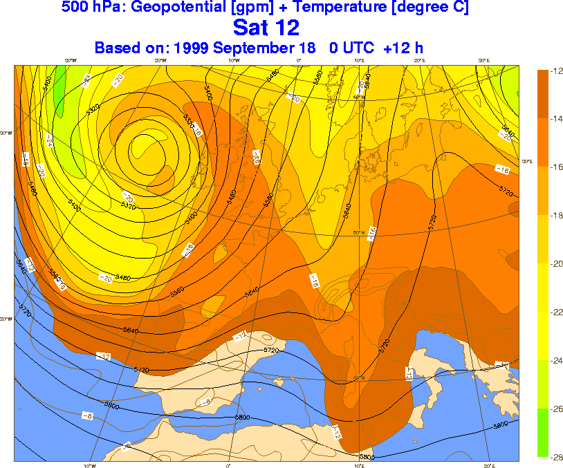 It was not until two days later (1200 UTC 20 September) that the 500 mb trough reached the Lago Maggiore region (Fig. 5). The 850 mb chart showed a frontal zone blocked by the eastern part of the Alps and the suggestion of a low forming on the lee side of the eastern Alps, over the Lago Maggiore region (Fig. 6). The MC2 indicated a cyclonic circulation developing at 850 mb in the Lago Maggiore region, with easterly components beginning to be apparent near the foothills of the Alps west on the west side the Lago Maggiore region (Fig. 7). The ECMWF 12 h forecast surface pressure for 1200 UTC 20 September showed the low on the lee side of the Alps in the Lago Maggiore region (Fig. 8). The 12-hour SM model forecast for the same time (not shown) had a similar surface pressure pattern. The 15-hour MC2 forecast of for 1200 UTC 20 September showed only moderate CAPE in the Lago Maggiore region (Fig. 9). The precipitation forecast by the MC2 showed a major rain event (Fig. 10).