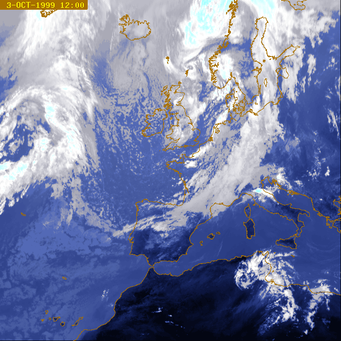 Sunday, 3 October 1999: The MC2 model continued to reinforce the idea that during the day there would be precipitation over the target area and on the upwind slope of the Ligurian Appennines, with little precipitation over the Milano area (Fig. 4) The satellite images showed a clearing zone in the western Po Valley at early times, but later cloudiness started to approach from the west (satellite-loop, Fig. 5). The Milano soundings at 0600 UTC and 1200 UTC showed weak destabilization (Fig. 6, Fig. 7); in Milan, the surface wind was east-southeasterly most of the day, and it was overcast, although the forecast indicated southerly flow and foehn-like conditions in the lee of the Ligurian Appennines (Fig. 8). The front moved very slowly during the day.