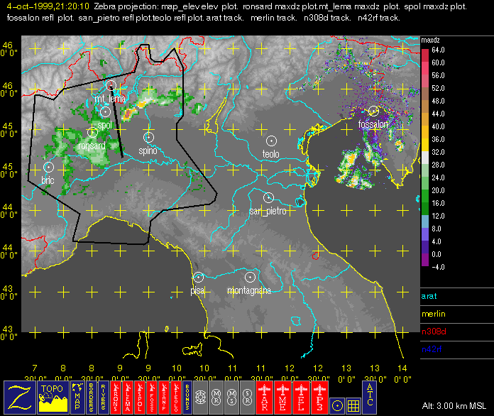 Monday, 4 October 1999: Precipitation moved out of the Lago Maggiore area early this morning and re-intensified over the eastern Po Valley. The P3 and Electra flew in this convection over northeastern Italy, the Adriatic Sea, and Slovenia, in view of the Fossalon radar (Fig. 17).