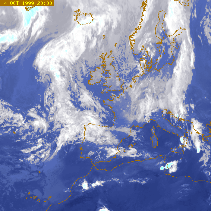 Tuesday, 5 October 1999: The forecast for the night of the 4th and the day of the 5th was for northerly downslope flow and drying over the Lago Maggiore region. No precipitation was expected in this region. However, the northerly flow aloft past the western end of the Alps formed a cyclone visible in the infrared satellite imagery as a circular, circulating mass of high cloud top, which moved eastward across northern Italy during the early morning hours of Tuesday (Fig. 18). In conjunction with this cyclonic circulation, intense convective cells formed in the easterly flow over the mountains to the northeast of Milan. These cells formed a squall line which moved over Milan during the early morning hours, and the convection moved on across northern Italy, as shown by the operational radar network of northern Italy (Fig. 19).