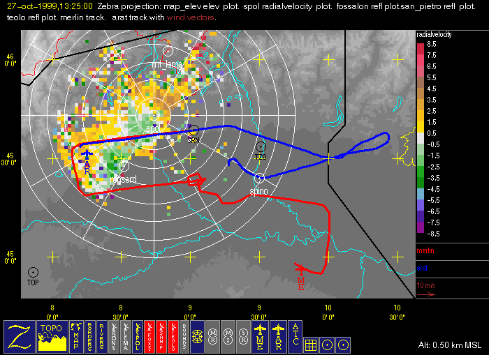 The RONSARD and S-Pol were operating during the flight, measuring clear-air returns in the boundary layer. The S-Pol radial velocity field at 1325 UTC revealed a vertical wind profile that is consistent with the Casale sounding (Fig. 5) taken by the Merlin aircraft. As shown in Fig. 7, the S-Pol measured southwesterly flow at 0.5 km, northeasterly flow at 1.0 km, north-northeasterly flow at 1.5 km, and northwesterly flow at 2.0 km MSL (range ring spacing is 10 km). It is also interesting to note the relatively strong up-valley flow (~ 8 m/s) into the Toce river valley and over Lago Maggiore at the 1.0 km level (Fig. 8; 10-30 km range at 330° azimuth).