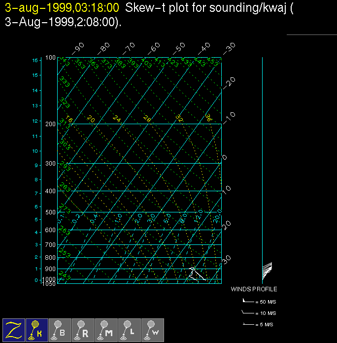 KWAJEX Weekly Sounding SummaryClick on "Plot" to see the skew-T for the sounding or select "Data" to see the data in tabular form. N/S signifies that no sounding was launched at the given time and location. AOP denotes an aircraft operational period. Soundings: July 30, 1999 (6-hourly)Use