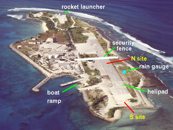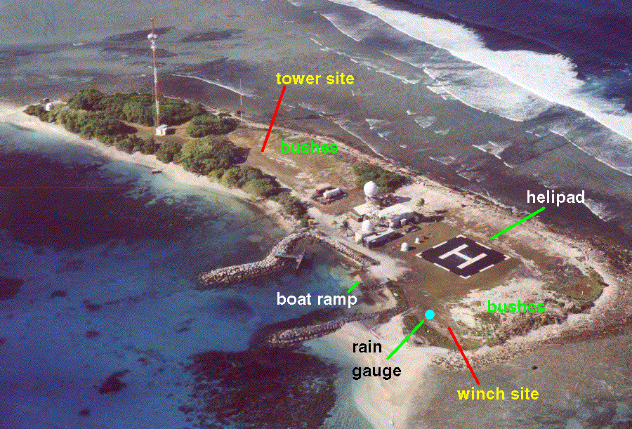 The cleared area of Legan is small and is primarily occupied by the helipad. The pathway from the boat ramp to the fuel storage near the cluster of buildings needs to be kept clear. With these considerations in mind, the only feasible location is about half way between the cluster of buildings and the helipad between two outhouses. This site would have unobstructed exposure to the sea surface on the lagoon side of the island and some blockage of the ocean side by vegation.