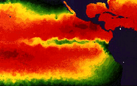 The map above shows the sea-surface temperature pattern on May 31, 1988, when the equatorial Pacific was cold. The warmest water is indicated by the dark red and progressively cooler water by yellow and green. Note the "tongue" of recently upwelled water extending westward along the equator from the South American coast. (Image courtesy of Otis Brown, University of Miami and Gene Carl Feldman, NASA, Goddard Space Flight Center.)