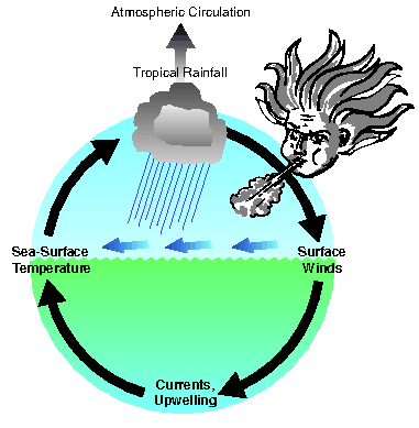Like partners engaged in an ongoing dialogue, the tropical Pacific Ocean and the overlying atmosphere influence and react to one another. Changes in the strength of the easterly surface winds along the equator induce changes in ocean currents and upwelling, which induce changes in sea-surface temperature, which alter the distribution of rainfall, which alters the strength of the easterlies, and so on...