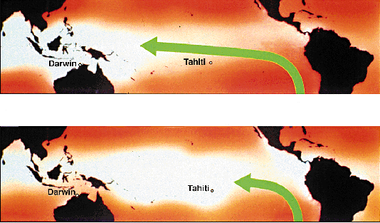Sir Gilbert Walker provided an important clue concerning El Niño when he discovered that air pressures at sea level in the South Pacific seesaw back and forth between two distinct patterns. In the "high index" phase of what Walker referred to as the "Southern Oscillation" (upper map for November 1988) pressure is higher (darker red) near and to the east of Tahiti than farther to the west of Darwin. The east-west pressure difference along the equator causes the surface air to flow westward, as indicated by the long arrow. When the atmosphere switches into the "low index" phase (lower map for November 1982) barometers rise in the west and fall in the east, signalling a reduction, or even a reversal of the pressure difference between Darwin and Tahiti. The flattening of the seasaw causes the easterly surface winds to weaken and retreat eastward as shown. We now know that the "low index" phase is usually accompanied by El Niño conditions.
