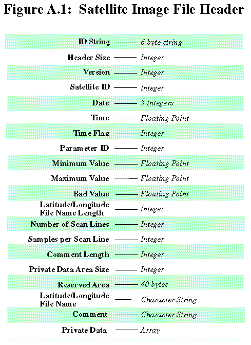Satellite image data files consist of two parts: a header and the data. The header contains information about the data such as when it was acquired, which satellite produced it, the amount and organization of the data, and the name of the latitude/longitude file that applies to it.