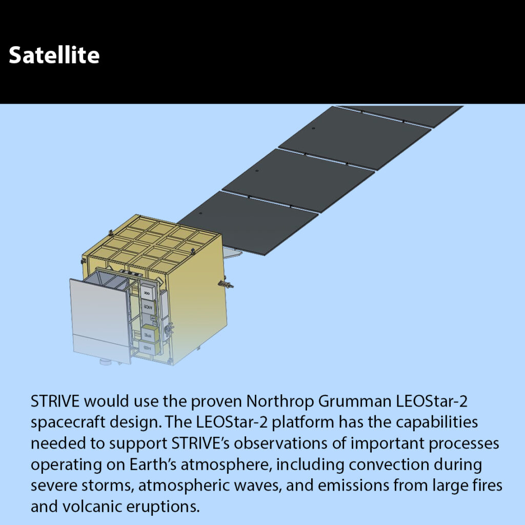 STRIVE launches into a Sun-synchronous orbit that enables near-global coverage from 82oN to 82oS over its three-year mission. The observatory is a high-heritage Northrop Grumman (NG) spacecraft, which provides the precise pointing control needed to enable groundbreaking observations. ALICE’s onboard capability to adjust pixel-binning and averaging allows for operational flexibility. NASA’s Goddard Space Flight Center (GSFC) builds the ALICE instrument, with BAE SMS providing the focal plane assembly, cryocooler, and associated electronics. Quantum Space (QS), in collaboration with Science Systems and Applications, Inc (SSAI) contributes the ARGOS instrument.