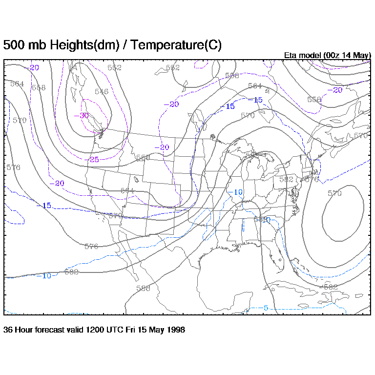 1. Using arrows, draw and label the Pressure Gradient Force (PGF), the Coriolis Force (CF), and tne actual wind (V) on the above 500 mb map. Draw these arrows for Seattle, Los Angeles, Oklahoma City, Minneapolis, Chicago, Washington D.C., and Miami. Be sure and make the length of each arrow proportional to the strength of the force (or wind speed). The closer the contours, the longer the PGF, CF, and V arrows should be. Remember to label your arrows!