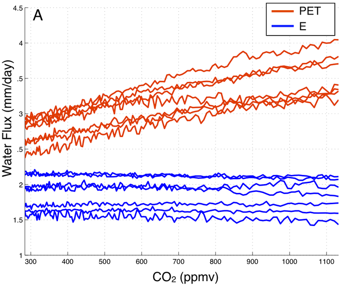 In work led by Swann, published in PNAS in 2016, we show that the physiological response of plants to rising CO$_2$ (e.g. allowing stomata to close) overwhelms the large increases in the demand for water from the atmosphere due to increasing temperatures as well as increases in water flux from CO$_2$ induced growth of plants. Including the biological control over water fluxes is therefore critical for assessing climate impacts of global warming—without doing so we would predict much drier conditions on land and more frequent and severe drought, a mistake that is widespread through the climate impacts literature. Our findings further demonstrate that ecosystems and climate must be considered together as a coupled system, particularly when assessing the response of the climate system to change. This work has led to related collaborations on tropical precipitation patterns driven by plant responses to increased CO$_2$ ( Kooperman et al. 2018) and an assessment of the ability of different “wetness” metrics to capture plant influences ( Leomordant et al. 2018).