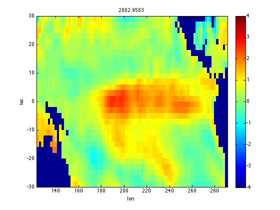 figure(1) clf for i = 1:nt PSSTAi = reshape(PSSTA(:,i),nlon,nlat); image([lonmin lonmax],[latmin latmax],PSSTAi','CDataMapping','scaled') xlabel('lon') ylabel('lat') axis xy title(num2str(yd(i))) caxis([-4 4]) colorbar getframe; % Used to force 'run' mode to spit out updated plot end