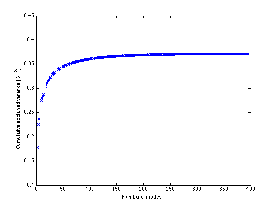 % Remove the land points before doing analysis to avoid issues with NaNs. SST = PSSTA(~land,:); % Remove any residual time-mean at each location. SST = SST - mean(SST,2)*ones(1,nt); [U,Sigma,V] = svd(SST,0); % Always use 0 argument (economy SVD option) to % prevent possible massive unneeded computation. sizeU=size(U) % Since ns>nt this only gives the first nt columns of U, which is % thus nt x nt % Other columns would correspond to zero singular values sizeSig=size(Sigma) % Also, we only get the first nt rows of S, which is thus nt x nt. sizeV=size(V) % This will be the full nt x nt matrix in this case. s = diag(Sigma); % Vector of singular values % Plot cumulative variance explained by first k modes normsqS = sum(s.^2) % Show sum of SVs equals normsqSST = sum(SST(:).^2) % sum of squares of entries of SST plot(cumsum(s.^2)/(ns*nt),'x') % Divide by number of entries in SST % to plot a cumulative mean square variance xlabel('Number of modes') ylabel('Cumulative explained variance [C^2]') varfrac1 = s(1)^2/normsqS % Fraction of variance explained by modes 1&2 varfrac2 = s(2)^2/normsqS