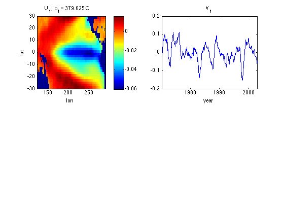 Uall = nan(ns,size(U,2)); Uall(~land,:) = U; U1 = reshape(Uall(:,1),nlon,nlat); % Turn column of U into a lat/lon % matrix including nan's at land points V1 = V(:,1); subplot(2,2,1) image([lonmin lonmax],[latmin latmax],U1','CDataMapping','scaled') xlabel('lon') ylabel('lat') title(['U_1; \sigma_1 = ' num2str(s(1)) ' C']) axis xy colorbar subplot(2,2,2) plot(yd,V1) xlabel('year') xlim([yd(1) yd(end)]) title('V_1')