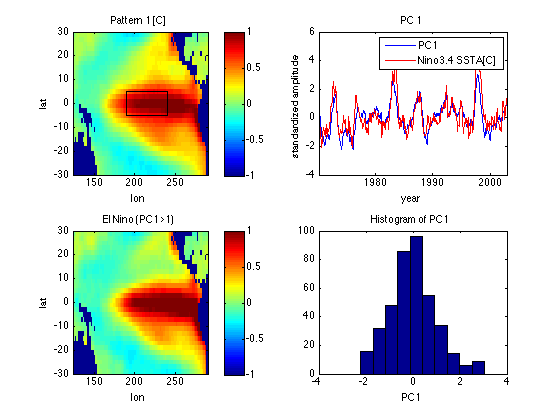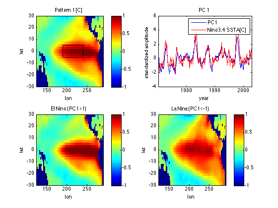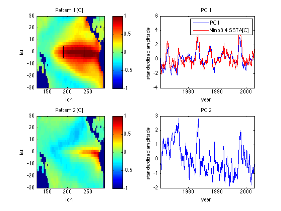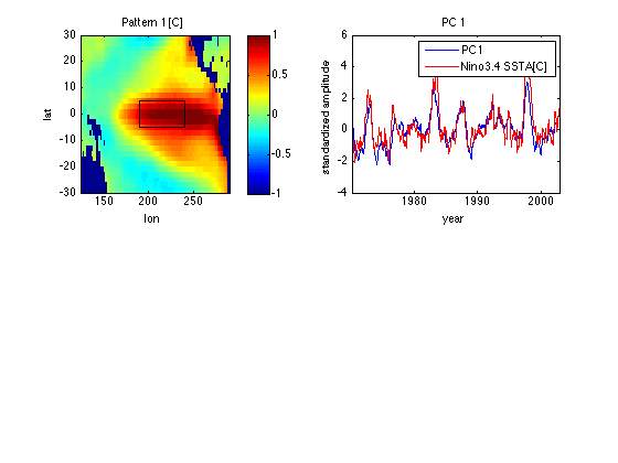 PC1 = -V1*sqrt(nt-1); % PC1 = V1 renormalized to have std=1 Ut1 = -U1*s(1)/sqrt(nt-1); % Ut1 = SST for PC1 = +1 std. % With 20-20 hindsight we also flip signs % of pattern and PC (which are ambiguous) % to match normal conventions. subplot(2,2,1) image([lonmin lonmax],[latmin latmax],Ut1','CDataMapping','scaled') xlabel('lon') ylabel('lat') title('Pattern 1 [C]') caxis([-1 1]) axis xy colorbar hold on % Add Nino3.4 region as a box plot([190 190 240 240 190],[-5 5 5 -5 -5],'k') hold off subplot(2,2,2) plot(yd,PC1) xlabel('year') ylabel('standardized amplitude') xlim([yd(1) yd(end)]) title('PC 1') load SSTA % SSTA = Nino 3.4 SSTA dataset from nino1.m; % also contains yr = corresponding decimal year inperiod = (yr>=yd(1)) & (yr <= yd(end)); SSTAN34 = SSTA(inperiod); R=corrcoef(PC1,SSTAN34); R = R(2,1) % Corr coeff of PC1 with Nino3.4 SSTA hold on plot(yr(inperiod),SSTAN34,'r') legend('PC1','Nino3.4 SSTA[C]') hold off % Note PC1 is very similar to Nino3.4 SSTA (see nino1.html), not % surprising since pattern 1 has a strong maximum loading in the Nino3.4 % averaging region of 120-170 W, 5S-5N.