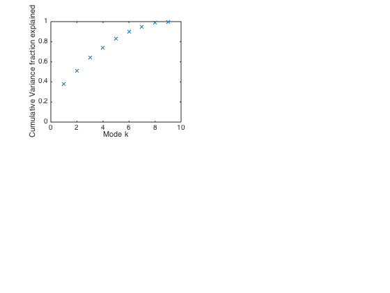 [U,Sigma,V] = svd(S,'econ'); % Always use economy SVD option to % prevent possible massive unneeded computation. s = diag(Sigma); % Vector of singular values % Plot cumulative variance explained by first k modes normsqS = sum(s.^2); figure(3) clf subplot(2,2,1) plot(cumsum(s.^2)/normsqS,'x') % Cumulative fraction of variance explained xlabel('Mode k') ylabel('Cumulative Variance fraction explained') ylim([0 1]) % We see mode 1 explains 40% of the variance; all other modes are less than % 15%. Thus, the first pattern is a useful combination of categories.