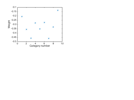 u1 = U(:,1); figure(4) clf subplot(2,2,1) plot(u1,'x') xlabel('Category number') ylabel('Weight') % This is a rough average across the categories, with all categories % having comparable negative weights.