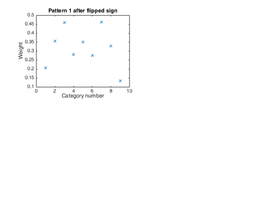 u1 = - u1; subplot(2,2,1) plot(u1,'x') xlabel('Category number') ylabel('Weight') title('Pattern 1 after flipped sign')
